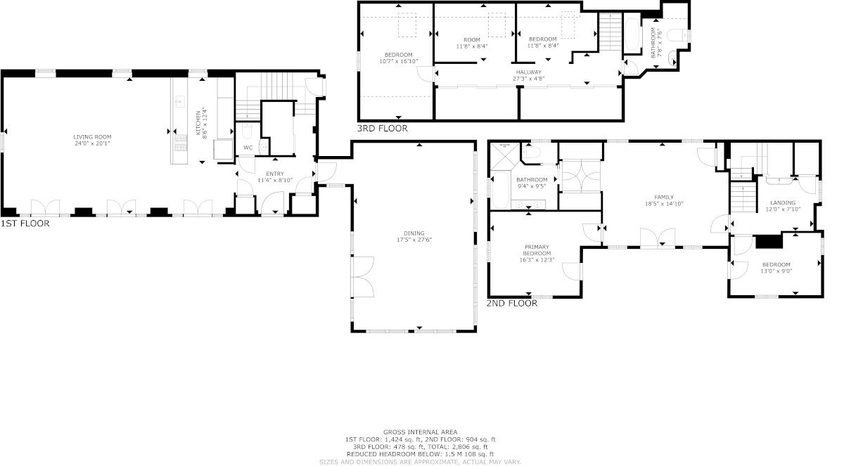 The Carriage House entry leads, on the left, to an open-concept kitchen transitioning into a contemporary family room, with large double doors for exit to the open terrace, while on the right, the conservatory boasts floor-to-ceiling windows that fill the space with natural light and lovely views of the surroundings. On the second floor, the Primary bedroom suite is complemented with a large sitting room that opens to a covered deck, and connects to its bathroom via a small hallway of mirrored closets. A second smaller bedroom, also with deck access, completes this level. The third floor contains a third bedroom plus two office-sized rooms and multiple storage closets. The guest cottage is notable for it’s sunken living room and a 2nd floor bedroom suite opening out to the greenery behind.